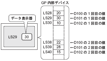 サンプリングデータを表示器内部デバイス(LSエリア、USRエリア)へ書き込むことで、データ表示器やグラフ部品を使用して収集したデータのうちの1つを表示するなど、データを個別に利用できます。