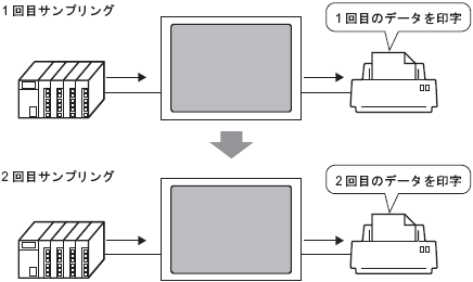 サンプリングデータの印字には、サンプリングするたびにそのデータを印字する方法(リアルタイム印字)と、収集した1ブロック分のデータを一括して印字する方法(ブロック単位印字)があります。