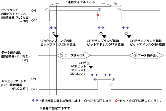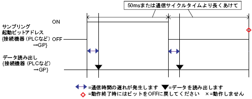 [サンプリング起動ビットアドレス]は、ON後すぐにOFFすると正常に動作しません。表示器がビット状態(ONまたはOFF)を認識できるまで保持してください。(ダイレクトアクセス方式の場合は通信サイクルタイムまたは50msのいずれか長いほう、メモリリンク方式の場合は50ms以上の時間が必要です。)