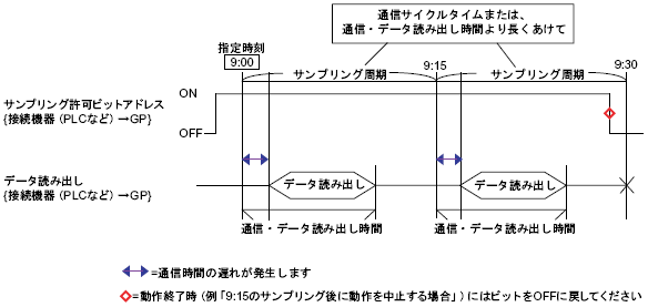 接続機器(PLCなど)の[サンプリング起動ビットアドレス]がONの間、指定した一定の周期でデータを読み出します。サンプリング周期の時間監視は表示器内部の時計で行われます。