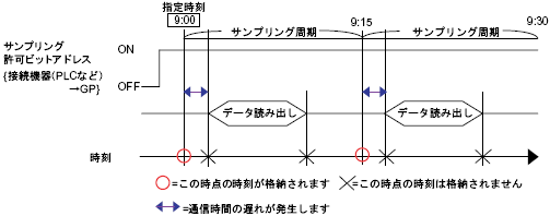 接続機器(PLCなど)の[サンプリング許可ビットアドレス]がONしている状態で、指定した[開始時刻]がくると、表示器は指定したアドレスのデータを読み出します。そのあとは指定した周期で読み出しを行います。
