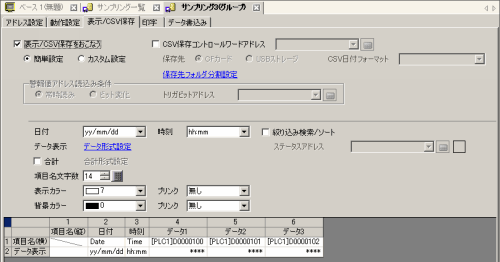 サンプリングデータを表示器画面上に表示する際、また外部ストレージにCSV形式で保存する際のフォーマットを設定します。フォーマット設定モードが[簡単設定]か[カスタム設定]かで設定項目が異なります。