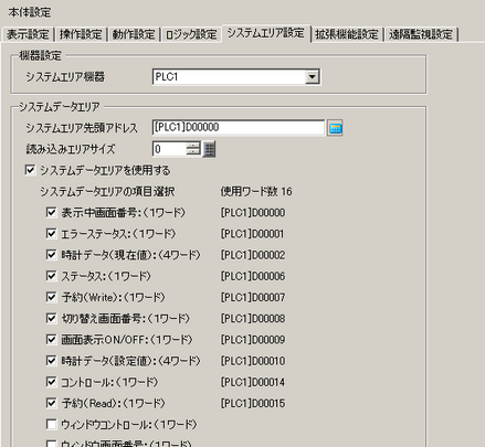 [システムエリア設定]タブを開き、[システムエリア先頭アドレス]を設定します。
