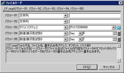 _CF_read ("\DATA", "DATA0001.BIN", [w:[PLC1]D0100], 0, 10) // (1)