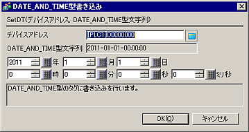 上記例はDATE_AND_TIME型デバイスの” [w:[PLC1]TagName]”に” 1970-01-02-03:04:05.06”を書き込みます。