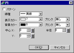 円の描画を指定アドレスに行います。「パターン」をチェックすると塗り込み円を描画します。線種(パターン選択時は塗り込みパターン)、色属性、中心座標、半径を設定します。また、中心座標、半径は、間接指定することができます。