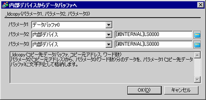内部デバイスに格納されている文字列データを1バイトずつデータバッファに文字列数分コピーします。パラメータ2で指定した文字列をパラメータ3の長さ分、パラメータ1のデータバッファに格納します。