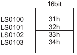 LS0100~LS103のデータをdatabuf0から連続して4バイト書き込みます。内部デバイスは1バイト単位(下位ビット)で読み込まれます。