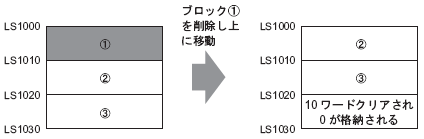 指定された1ブロックを削除し、以降のデータをブロック単位で上に移動します。削除するブロックの指定はオフセットで指定します。エラーが発生した場合、LS9151にエラーステータスを書き出します。