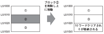 ブロックのオフセット2の位置から、ブロック(10ワード)単位でデータが上に移動し、最終ブロック(10ワード)が0クリアされます。