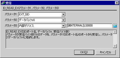 受信バイト数分のデータを外部機器から受信して、データバッファに格納します。パラメータ3で指定したバイト数分、外部機器から受信して、パラメータ2で指定したデータバッファに格納します。