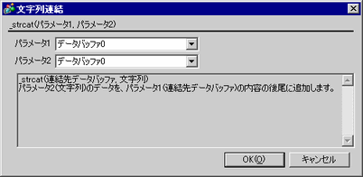 文字列または文字コードを文字列バッファに連結します。パラメータ2で指定した文字列または文字コードをパラメータ1の後ろに連結します。