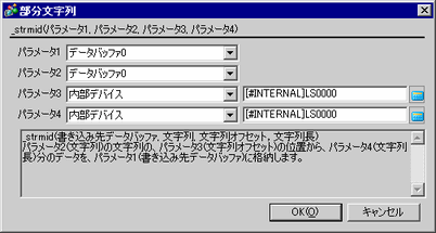 文字列の指定したオフセットから文字列長分抽出して別のバッファに取り出します。パラメータ2で指定した文字列のパラメータ3で指定したオフセット値からパラメータ4で指定した長さ分の文字列をパラメータ1で指定したデータバッファに格納します。
