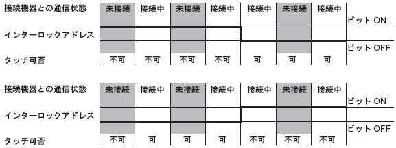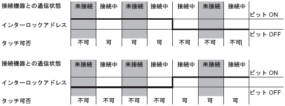 グローバルインターロックアドレスに外部接続機器のアドレスを指定した場合、その接続機器との通信が確立するまでタッチ有効条件の判定ができません。このため、通信が確立するまでは[ビットON時有効]/[ビットOFF時有効]の設定に関係なく、グローバルインターロック中となります。