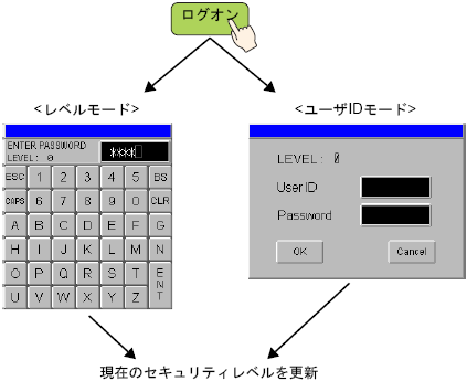 ユーザIDモードの場合は、セキュリティ設定で存在するIDであれば、どのIDを入力しても受け付けられます。パスワードが正しく入力されると、IDに設定されているレベルに「現在のセキュリティレベル」が変更され、システム変数「#H_LoginUserID」も更新されます。