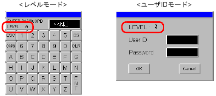 レベルモードの場合は、セキュリティ設定でパスワードが設定されているレベルであれば、どのレベルのパスワードを入力しても受け付けられます。パスワードが正しく入力されると、そのパスワードが設定されているレベルに「現在のセキュリティレベル」が変更されます。