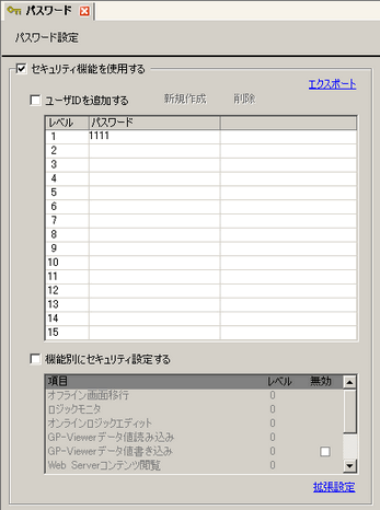 パスワード設定画面が開きます。[セキュリティ機能を使用する]にチェックを入れ、[レベル1]にパスワード「1111」を入力します。