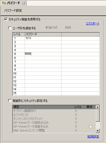 パスワード設定画面が開きます。[セキュリティ機能を使用する]にチェックを入れ、[レベル1]にパスワード「1111」を、[レベル5]にパスワード「5555」を入力します。