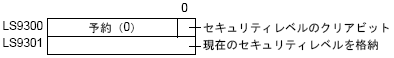 内部デバイスアドレスのビット操作でクリアLS9300の0ビットめをOFF→ONするとセキュリティレベルのクリアが行われ、LS9301に格納されている現在のセキュリティレベルが0になります。セキュリティレベルのクリア完了後、LS9300の0ビットめをOFFに戻してください。(LS9301は読み込み専用です)
