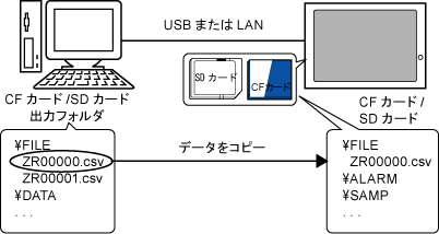また表示器内のCFカード/SDカードに格納されているデータ(アラームデータやサンプリングデータなど)をパソコン側にコピーできます。