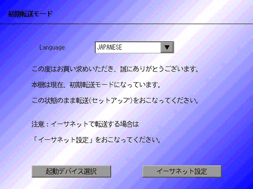 表示器の電源をONします。[初期転送モード]画面が表示されます。英語画面が先に起動するので[Language]の右部分をタッチして[JAPANESE]に変更します。