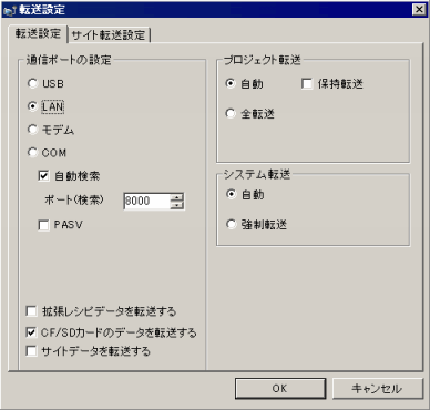 [転送設定]ボタンをクリックします。次のダイアログボックスが開きます。[通信ポートの設定]で[LAN]を選択し、[自動検索]にチェックが入っていることを確認して[OK]をクリックします。
