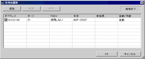 [プロジェクト送信]をクリックすると[本体の選択]ダイアログボックスが開き、あらかじめ設定されていた表示器のIPアドレスが表示されます。IPアドレスにチェックを入れて、[OK]をクリックします。転送が開始されます。複数のIPアドレスにチェックを入れると、一回で複数の表示器にプロジェクトを送信できます。
