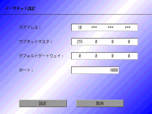 表示器にIPアドレスを設定します。[イーサネット設定]をタッチすると、次の画面が表示され、出荷時に設定されている内容が表示されます。