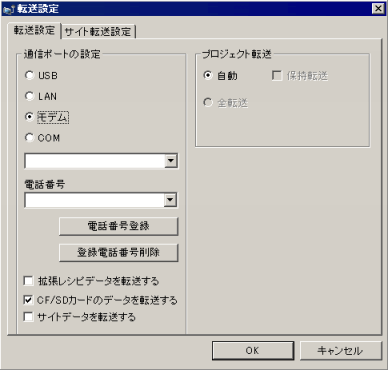 [転送設定]をクリックすると次のダイアログボックスが開きます。[通信ポートの設定]で[モデム]を選択します。
