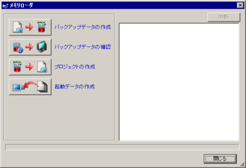 現在GP-Pro EXで開いているプロジェクト(または [プロジェクト選択 ]で選択したプロジェクト)のバックアップデータ(*.cml)と表示器で起動するためのメモリローダツールを、[出力先の選択]で指定した出力先フォルダに作成します。出力先には外部ストレージのルートフォルダ(ディレクトリ)を選択してください。