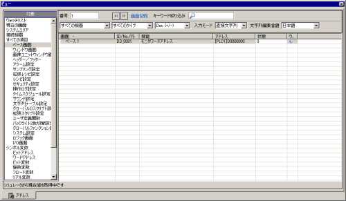 [アドレスビュー]では、シミュレーションで使用している仮想接続機器アドレスの現在値を一覧表示または編集できます。 [対象]から表示したい項目を選択します。(例 : ベース画面)