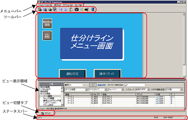 [アドレスビュー]、[ロジックビュー]、[I/Oビュー]、[ファンクションビュー]を表示する領域です。