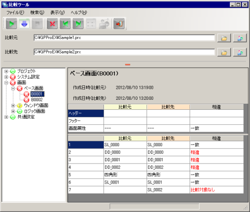 比較元、比較先に設定したプロジェクトファイルの比較を実行します。