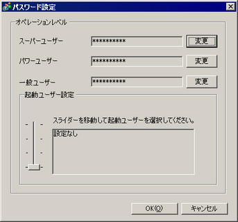 [パスワード設定]の[起動ユーザー設定]でユーザーレベルを設定すると、次回起動時より設定したユーザーレベルが現在のユーザーレベルとなります。