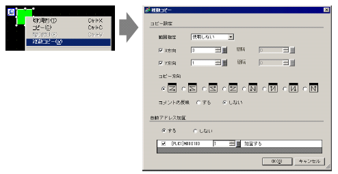 [複数コピー]ダイアログボックスが表示されますので、[範囲指定]は[間隔で設定]を選択し[X方向]を「3」、[Y方向]を「1」に変更します。[自動アドレス加算]の[する]を選択し、コピー元のアドレス「M100」に加算幅「1」が設定されていることを確認して[OK]をクリックします。