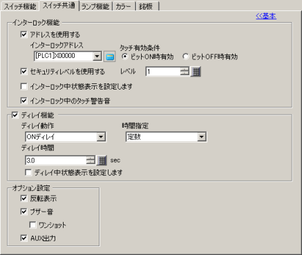 タッチ時のブザー音の設定変更やタッチ中の反転表示など、スイッチ機能のオプション設定ができます。