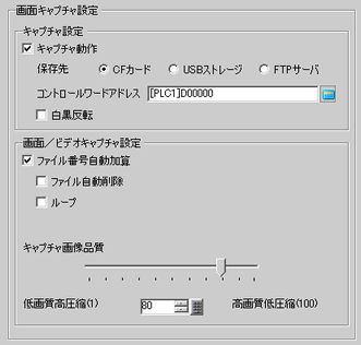 画面キャプチャのトリガとなるコントロールワードアドレスを設定します。設定した[コントロールワードアドレス]から3ワード分を使用してファイル番号や、ファイル出力の実行、保存処理結果(ステータス)の確認を行います。