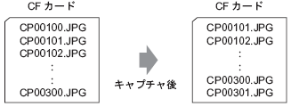 例) CFカード内に「CP00100.JPG」~「CP00300.JPG」まで存在しているとき