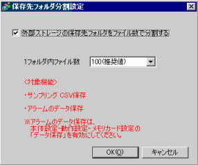 設定はアラーム履歴データとサンプリングデータの両方に適用されます。どちらか一方のフォルダのみを分割したり、別々のファイル数を設定することはできません。