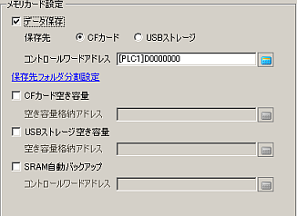 バックアップメモリ(SRAM)内に格納されたデータを外部ストレージに保存するかどうかを指定します。保存する場合、[保存先]を[CFカード](または[SDカード])、[USBストレージ]から選択します。