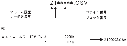 例えば、ファイル番号を「2」としてブロック1のアラーム履歴データ保存のコマンドを書き込むと、外部ストレージの[ALARM]フォルダ内に、ファイル名「Z100002.CSV」としてデータ出力されます。