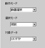 [動作モード]から[動画選択]を選択します。[選択モード]から[複数]を選択し、[対象データ]から[CF/FTP]を選択します。
