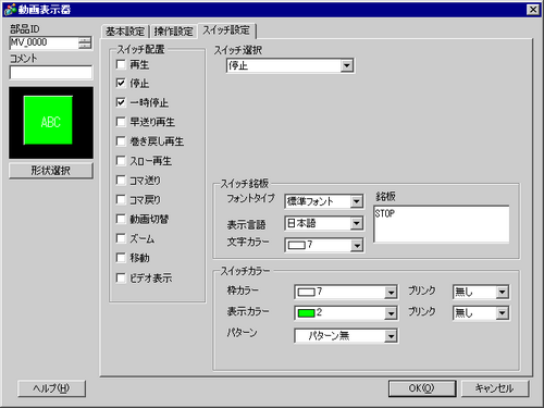 操作用のスイッチを配置します。[スイッチ設定]タブを開き、[スイッチ配置]の[停止]、[一時停止]を選択します。