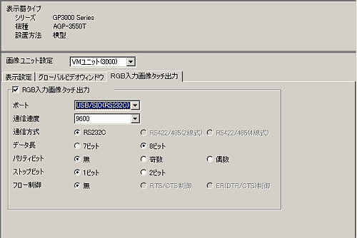 RGB入力で表示器に表示中の画面をタッチした際、タッチ座標情報をシリアル通信で外部接続機器に出力するかどうかを選択します。