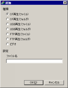 CFカード/SDカード内のMOVIEフォルダに保存されているファイルを再生リストに追加します。[ファイル名]に「\MC」と入力した場合、自動的に「\MOVIE」と「\」が補完され「\MOVIE\MC\」となります。