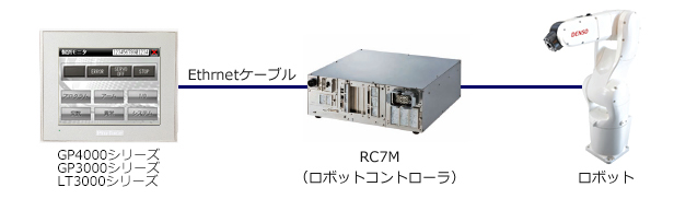 GP4000/GP3000/LT3000シリーズと株式会社デンソーウェーブ製ロボットコントローラRC7Mを接続し、ロボットの状態を表示できます。ロボットのティーチングペンダントがなくても現在のロボットの状態をある程度把握することができます。
