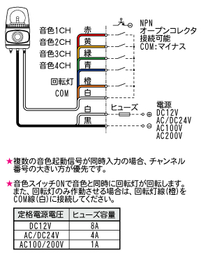 ・小型ながら105dBの大音量で内蔵ボリュームで無段階に調節できます。 ・同時に複数の電子音起動信号が入った場合、大きい番号の信号を優先します。 ・外部接点回路は無電圧回路で、P.L.C.(NPNオープンコレクタ)による直接駆動が可能です。 ・回転灯は外部接点で制御できます。 ・電子音は回転灯と連動しており、電子音吹鳴中に回転灯も動作します。 ・明瞭で区別しやすい4種類のアラーム音を外部接点で制御できます。 ・保護特性IP23(正方向取り付け時)です。 |