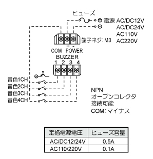 ・4種類の電子音(2種類のアラーム音と2種類のメロディ)を外部信号で制御できるマルチタイプです。 ・同時に複数の電子音起動信号が入った場合、若い番号の信号を優先します。 ・音量は最大83dBで、本体側面のボリュームにより0〜83dBまで無段階の音量調節が可能です。 ・外部接点回路は無電圧回路で、P.L.C.(NPNオープンコレクタ)による直接駆動が可能です。 ・保護特性IP30 水のかからない場所でお使いください。 |