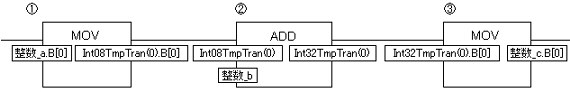 "Int08TmpTran(0)"に格納した整数データと"整数_b"を加算し、結果を"Int32TmpTran(0)"に格納します。 |