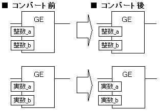 GE命令に割り付けた変数タイプが異なる場合、EXでは1つの命令に異なるタイプの変数を割り付けることができないため、変数タイプを合わせるための変数命令を追加してコンバートします。